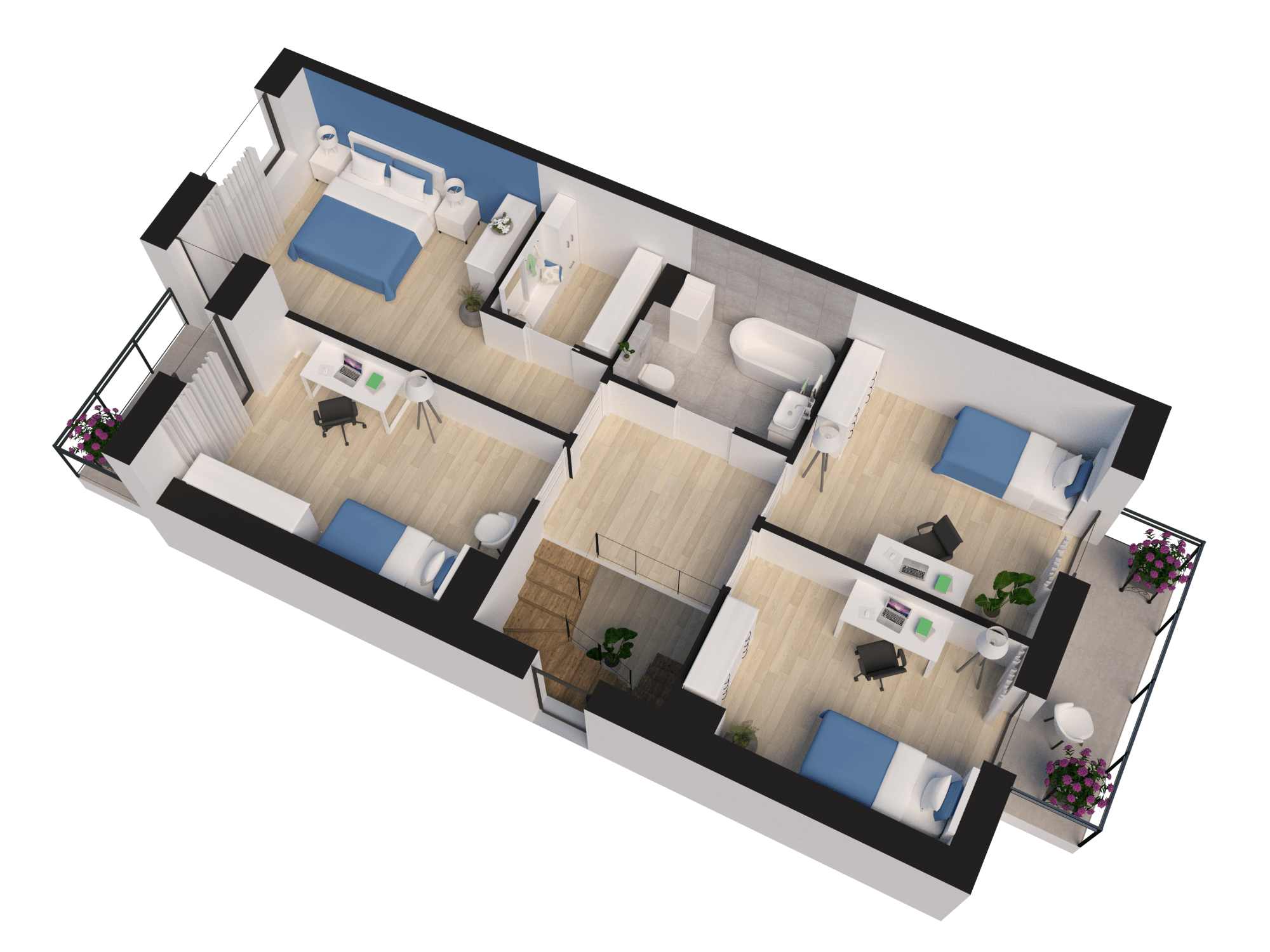 Prywatna część na poddaszu składa się z dwóch pokoi dla dzieci, łazienki i sypialni z tarasem i garderobą.